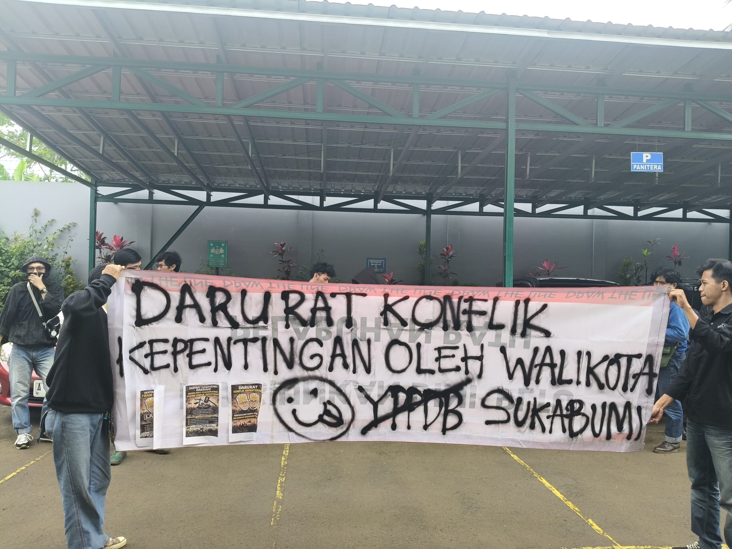 Saat Mahasiswa Membentangkan Spanduk di Gedung Pengadilan Negeri Sukabumi